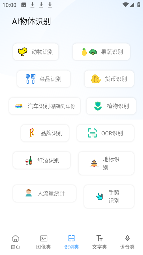 识别类工具:动物识别、果蔬识别、菜品识别、货币识别、汽车识别(精确到年份)、植物识别、品牌识别、OCR识别、通用识别……