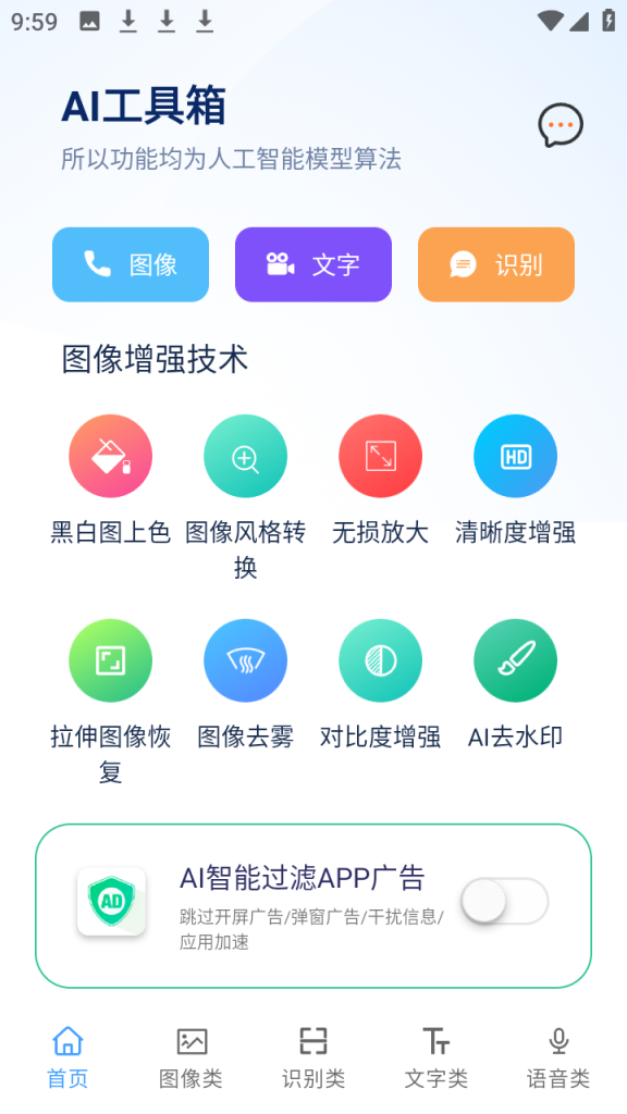图像类工具:黑白上色、清晰度增强、对比度增强、色彩增强、风格转换、人像动漫化、人像背景分离、图像去雾、无损放大、拉伸恢复、AI魔术橡皮擦、AI去水印……