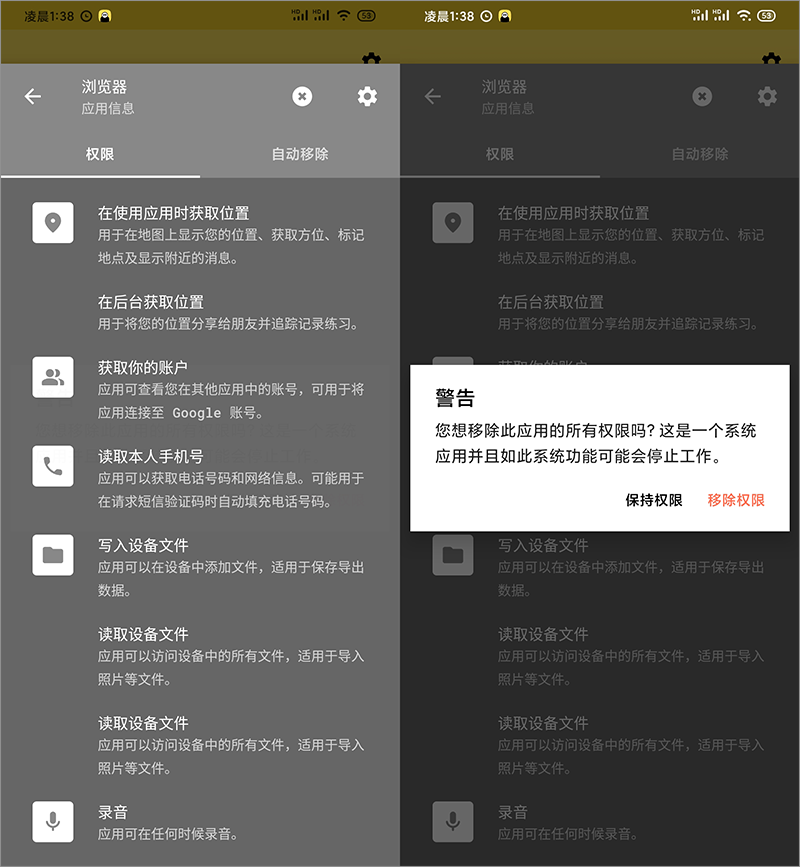 在功能设置里面支持移除权限的时间,例如你每天重度使用某个 APP 的话,可以设置较长的时间,支持导入导出配置文件,支持 ROOT 模式,获得更快的权限处理效果。