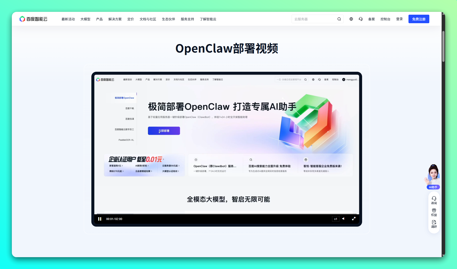 百度提供了免费且傻瓜式的 OpenClaw 部署方案,还将 OpenClaw 接入了自家的百度 APP 。如果你是纯小白,只需在百度 App 上点两下就能一键免费部署,整个过程不到一分钟,可以说是有手就行。如果你在百度智能云完成了部署,那么直接在百度 APP 的搜索框或消息中心就可以调用 OpenClaw 。