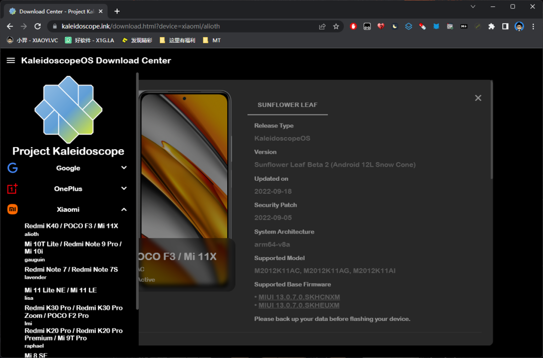 目前「KaleidoscopeOS」支持的机型比较少,只有 Google、OnePlus、小米 的部分机型,毕竟这个固件刚出来不久,可能还需要点时间去适配其它机型吧。如果你的机型没在支持列表中,也可以找找看有没有移植适配版。