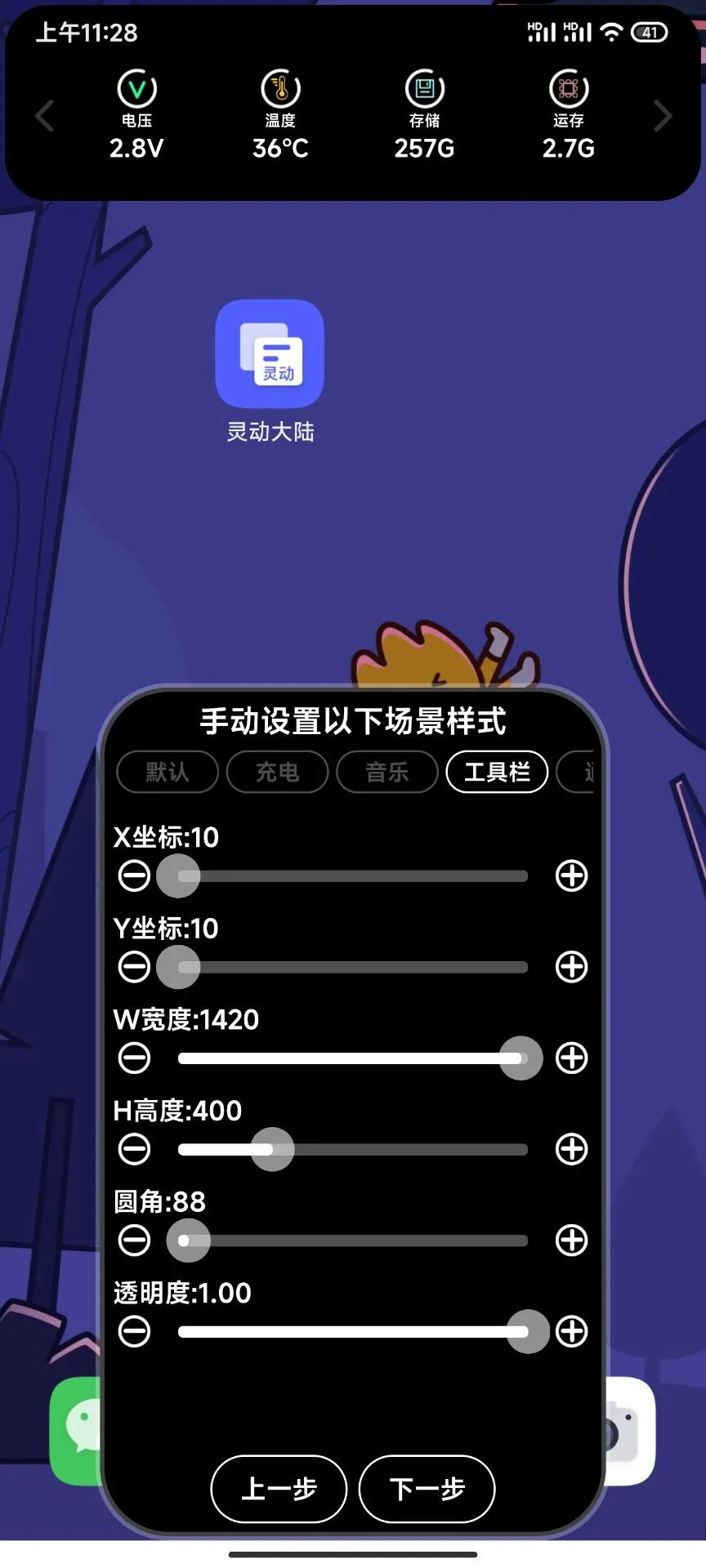 另外「灵动大陆」还加入了一些颇具特色的功能,用户能够手动呼出弹窗,并进行查看手机运行参数、快捷调出支付宝/微信扫码等操作。