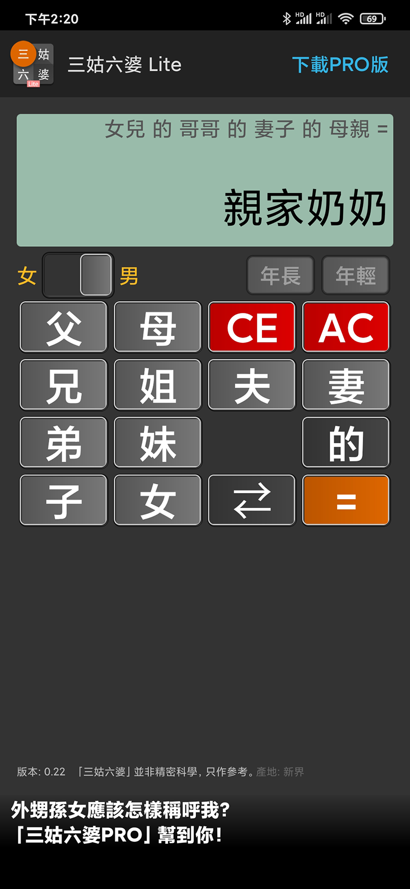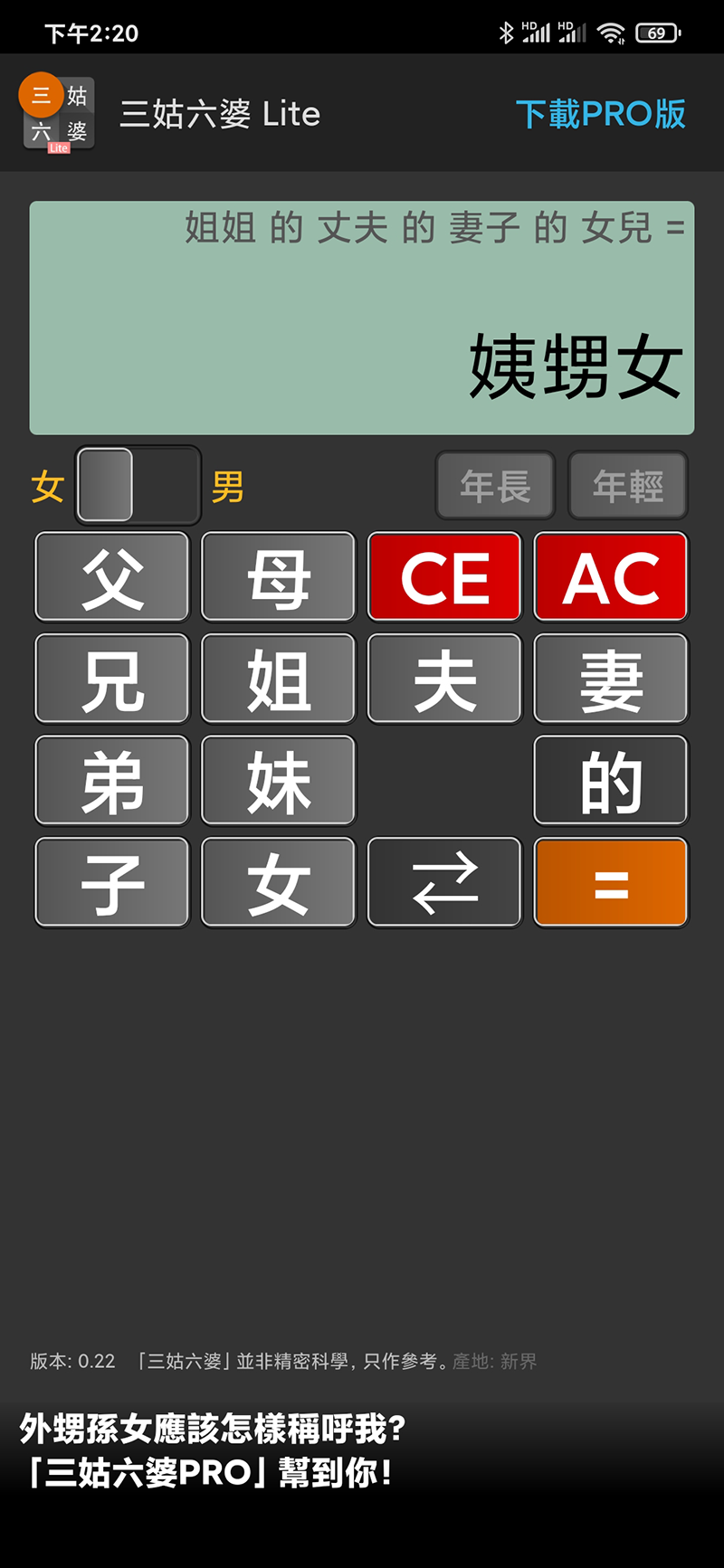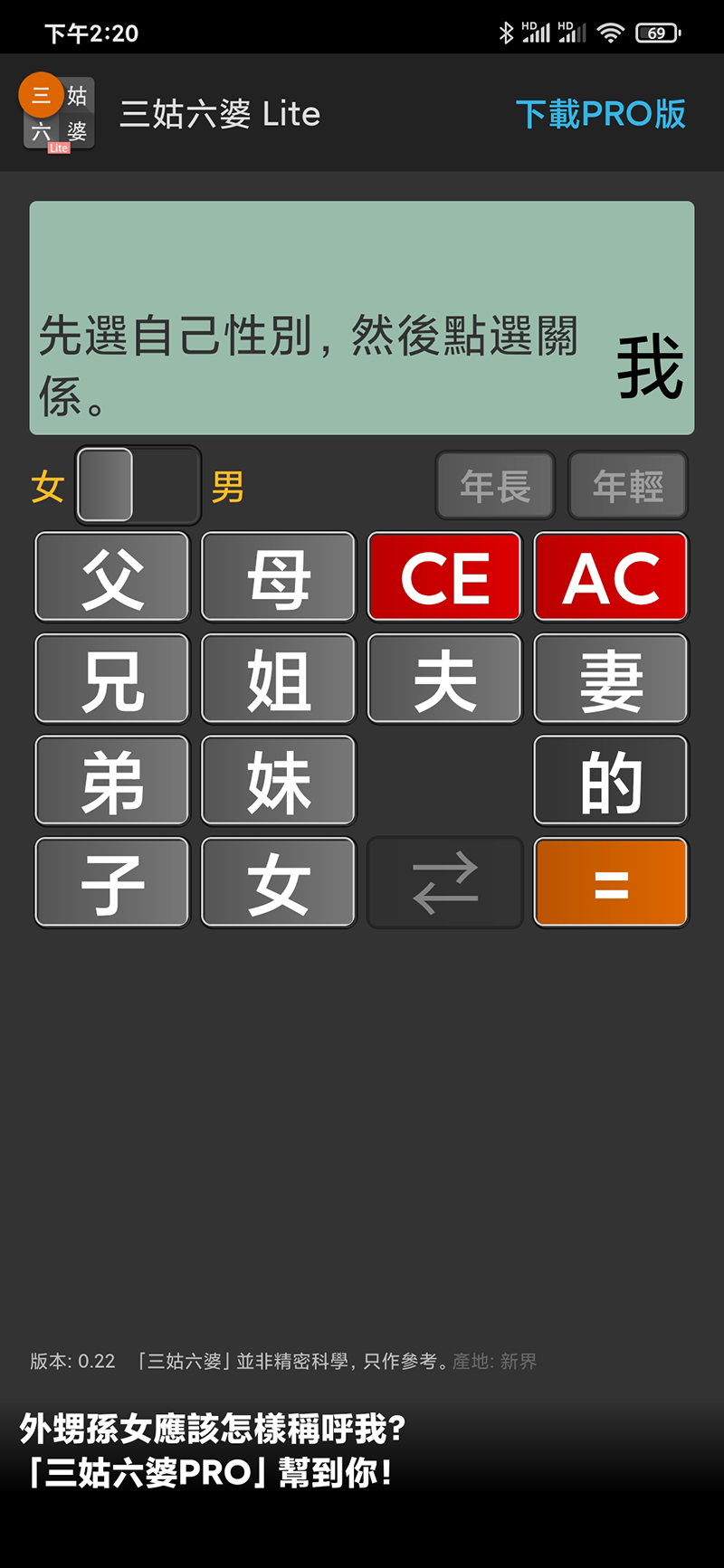 使用起来和计算器类似,选择你的性别,然后选择父母子女妻子等关系+的关系,再点等于,就可以得出结果了。
