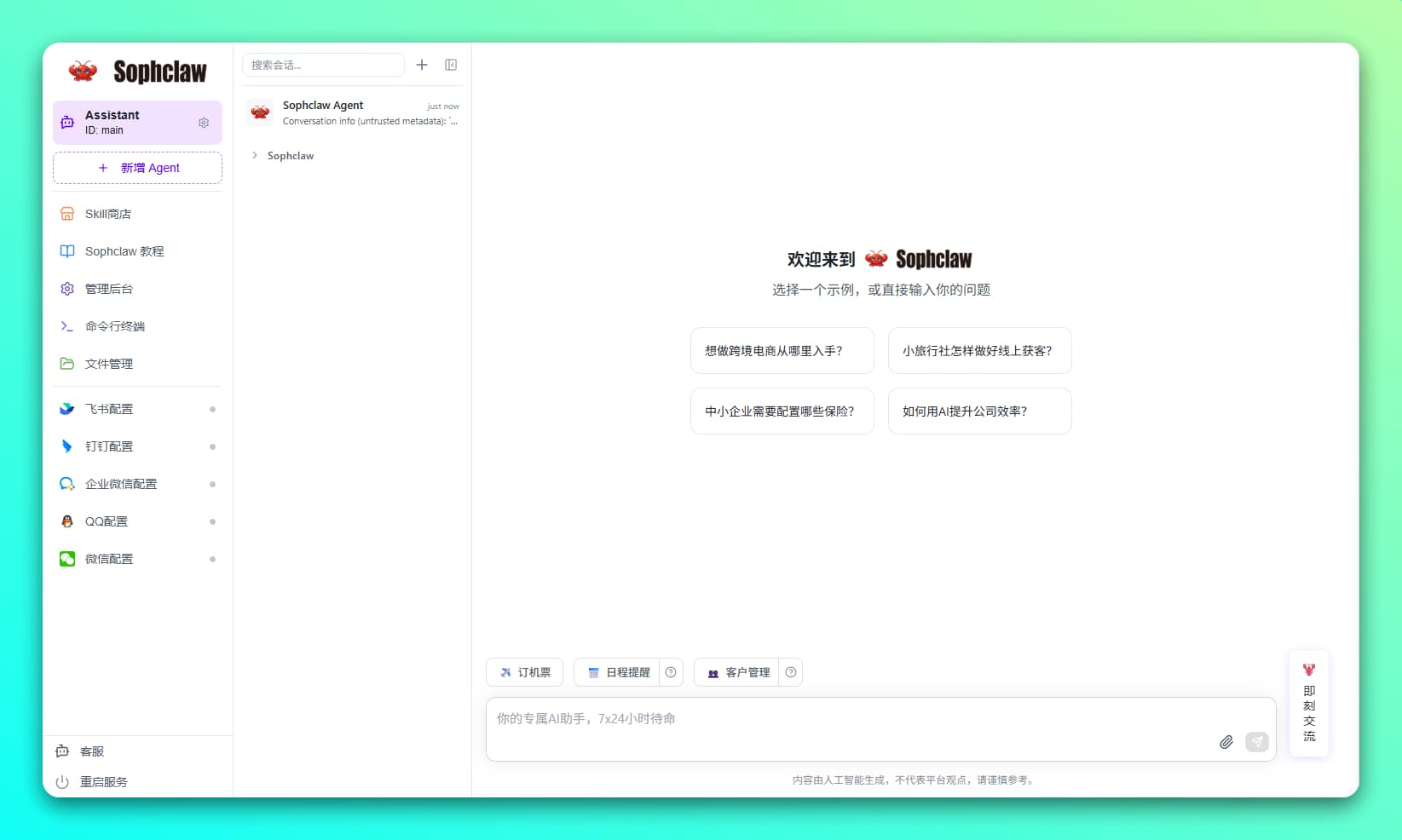 SophNet 是算能自研的一站式模型推理 API 服务平台,支持多种 AI 模型和算力设备接入,提供低代码开发工具,适用于从简单 API 到复杂 Agent 智能体的构建。目前也上线了「Sophclaw」 一键部署 OpenClaw 小龙虾,可养成的私人AI助理,越用越懂你、越用越好用。目前 Sophclaw (小龙虾) 已顺利打通微信、飞书、钉钉、QQ、企业微信等主流 IM 渠道。